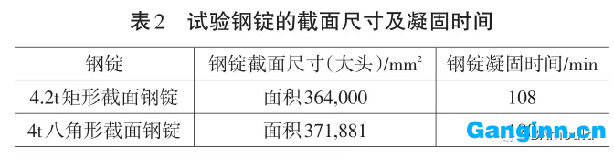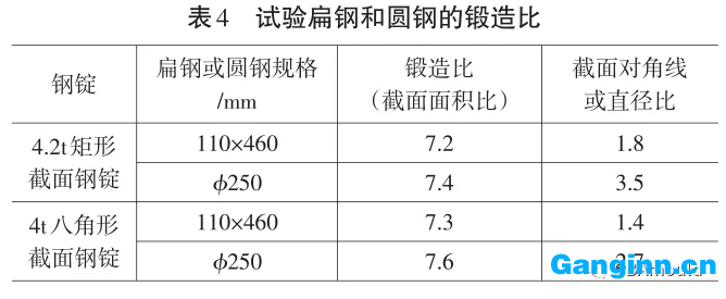 實(shí)驗(yàn)鋼的生產(chǎn)工藝流程:30t EAF+LF+VD冶煉廠→模鑄4.2t矩形框橫截面鑄鋼件和4t八角形橫截面鑄鋼件→鑄鋼件加溫→2,000t快鍛機(jī)鍛制110×460Mm鍍鋅扁鋼和 ? 250Mm園鋼→不銹鋼板材淬火→取片檢測。