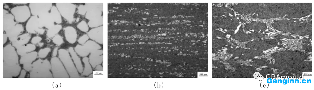 Cr12Mo1V1鑄鋼件經(jīng)熱處理后, 如圖所示1a所顯示的鑄鋼件鍛造態(tài)網(wǎng)狀結(jié)構(gòu)共晶滲碳體沿形變方位呈帶條狀或網(wǎng)狀結(jié)構(gòu)延伸, 形變充足時(shí)呈帶條狀如圖所示1b所顯示, 形變不充足時(shí)網(wǎng)絡(luò)狀如圖所示1c所顯示。實(shí)驗(yàn)鍍鋅扁鋼和園鋼的共晶滲碳體如圖2所顯示, 按GB/T14979-1994規(guī)范中第四定級圖鑒定的共晶滲碳體不勻稱度級別如表3所顯示。